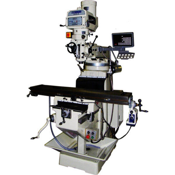 Manual variable speed spindle drive, 3 Horsepower runs the spindle from 60 to 4200 RPM. Spindle speed dial on head shows RPM in direct drive and back gear. Spindle motor is finned for cooling. Sino three axis digital readout has 0.0002″ resolution. Readout comes mounted to knee, table and cross and is ready to use. The readout is inch/metric switchable, with absolute incremental function. There is a calculator function, bolt hole pattern function, line pattern function, and arc calculate function. A comprehensive manual is included.